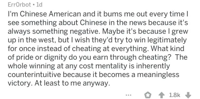 “我是华裔美国人,每次看到这种中国的负面新闻我都羞愧难当……我希望中国可以至少堂堂正正地赢一次,而不是每次都作弊。”