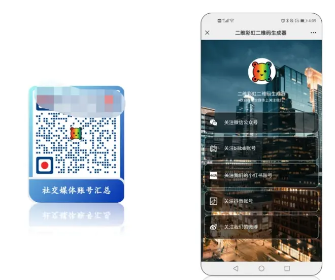 可以通过一个社交媒体二维码,将这些不同功能的小组放在一个二维码中。(下图仅作为参考示例)