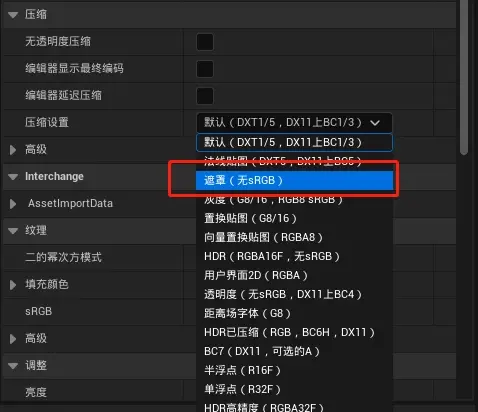 通道RGB:R=AO(环境遮挡),G=粗糙(光滑),B=高光/金属。多通道贴图需双击贴图在右侧将压缩设置改为“遮罩”,多通道贴图才能正常应用到模型上。