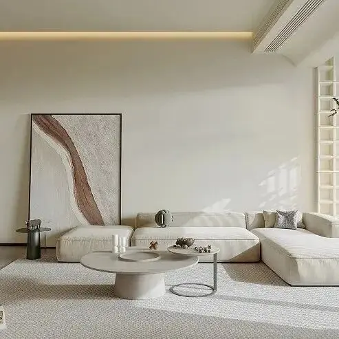 浓厚素色调包裹下,引爆了一场侘寂与轻奢之美的视觉冲击,轻奢金属与微水泥质感的冷酷感充分融合,在自然光线的晕染下呈现光洁寂静、且高级的氛围。