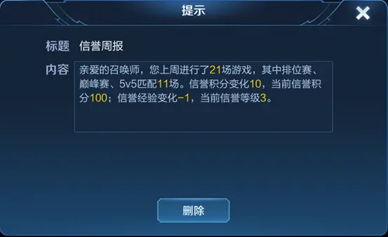 还有部分召唤师不知道近期信誉积分和等级的变化,新增信誉周邮件,方便大家便捷地了解上周的比赛场次和信誉变化。