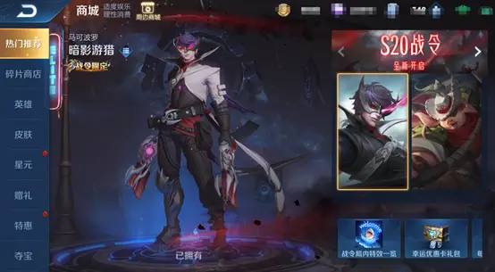 召唤师们在进入商城时,将会看到英雄/皮肤的全屏展示动画,点击后可以退出观看,进入商城推荐主页,查看热门推荐的英雄/皮肤/商品!