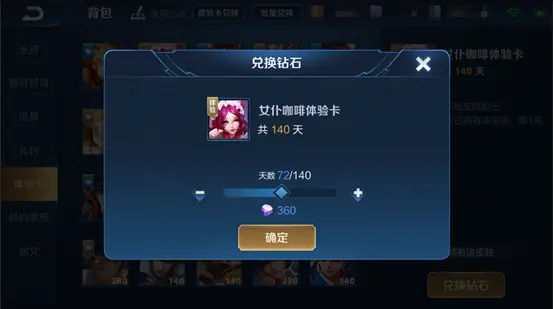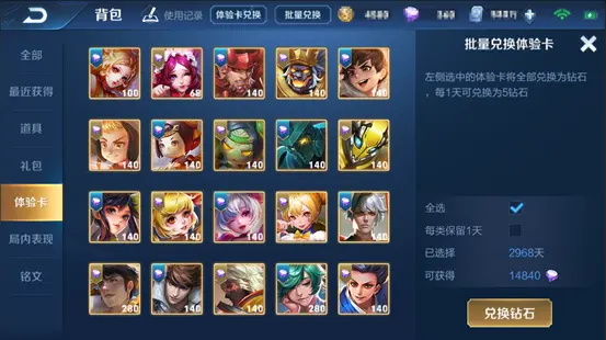 2、对于已拥有英雄/皮肤/永久局内表现的体验卡,我们优化了兑换为钻石的流程,对于单个体验卡兑换钻石,可以快速选择天数进行兑换,同时我们也增加了【批量兑换】功能,各位召唤师可以前往【背包】-【体验卡】/【局内表现】进入【批量兑换】,根据需要选择【全选】或者【每类保留一天】,亦可手动再次选择左侧亮起的体验卡头像,进行取消选中。