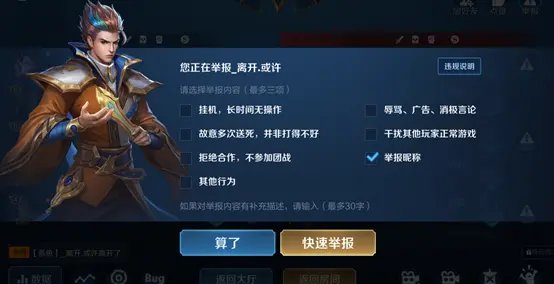 我们新增了“举报昵称”昵称选项,大家在对局中遇到违规的昵称可以积极向狄某反馈,而不用专门进入违规召唤师的主页进行举报了。