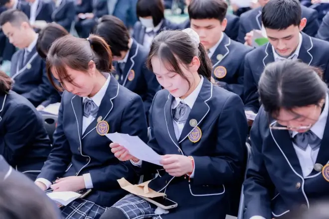 大会伊始,高三全体教师朗诵《修身齐家治国平天下》,谆谆教导学生们要崇德向善。这也象征着同学们进入成人社会的责任与担当。