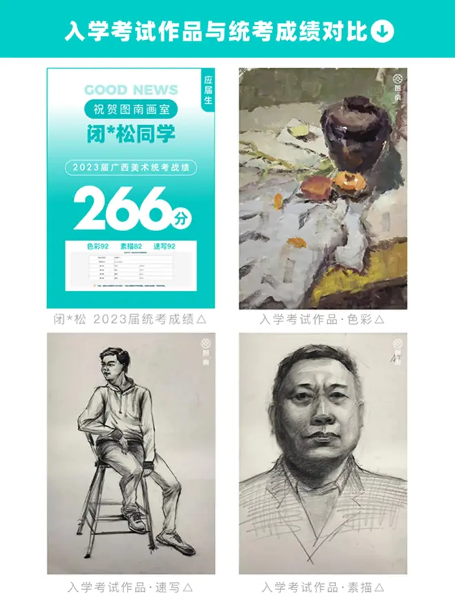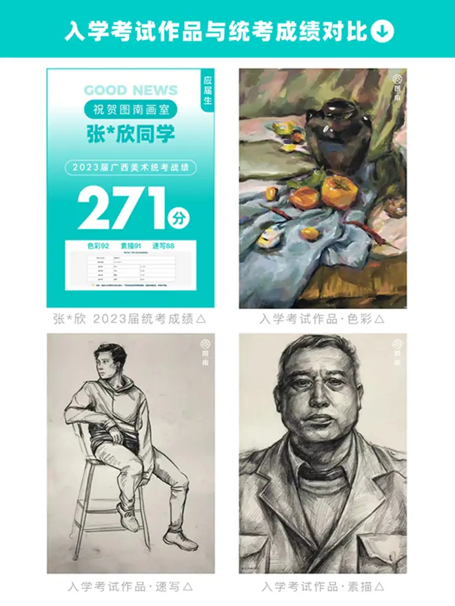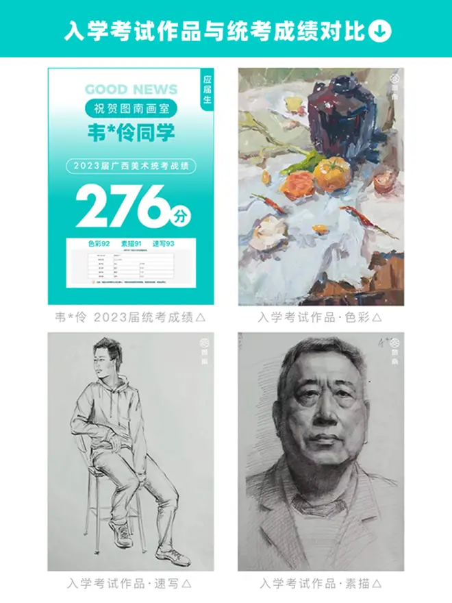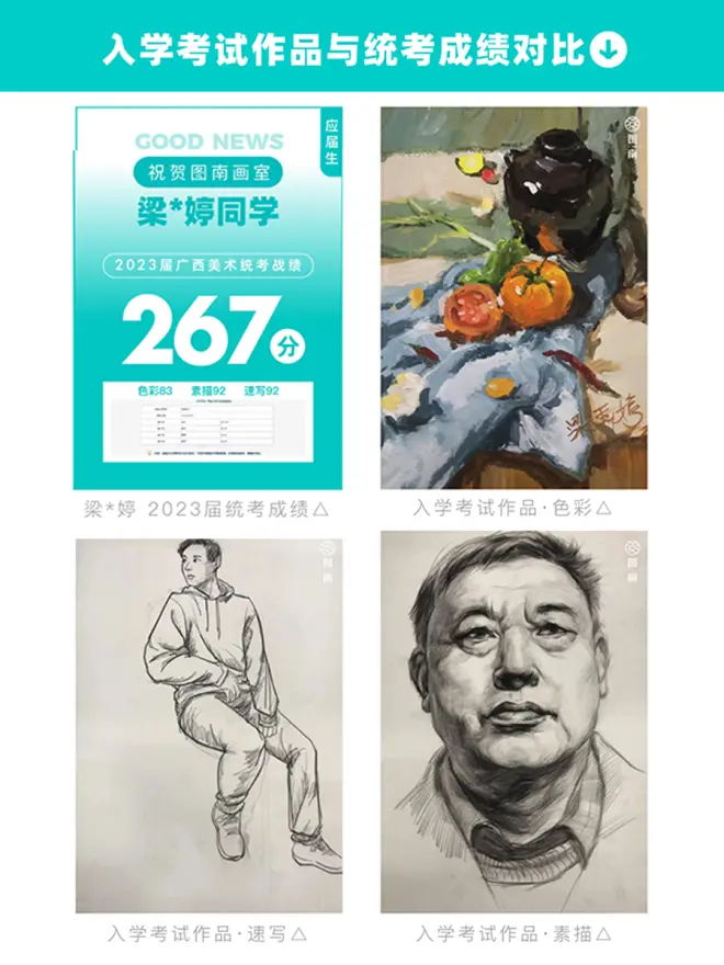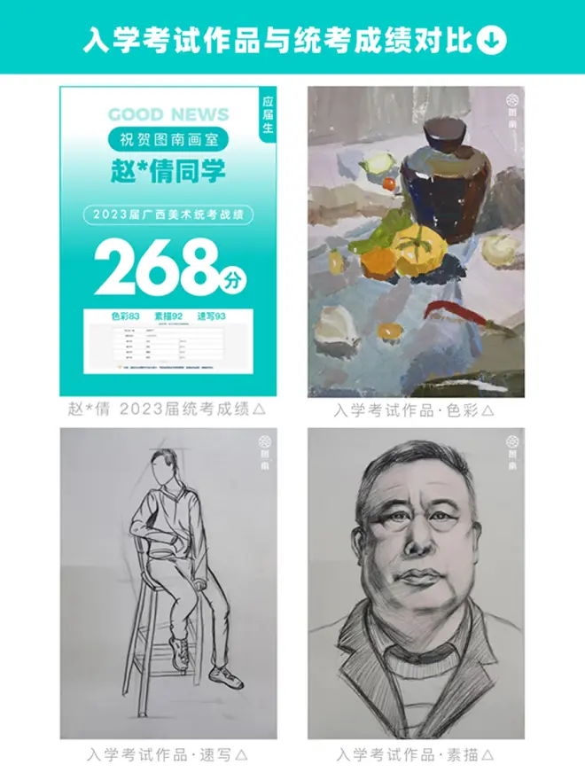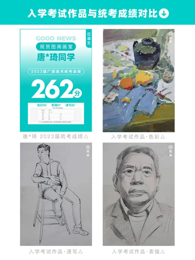 许多想要参加艺考的同学可能会好奇,集训五六个月的时光,自己的基础究竟能够提升到什么水平,统考能拿多少分?如果你对自己没有信心,看看图南2023届学员的入学作品吧,对比他们广西美术统考的高分成绩,你会获得想要的答案。