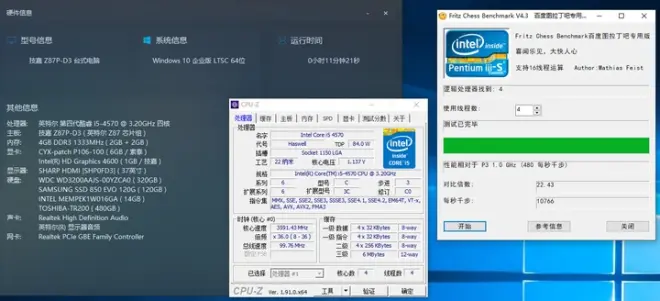 这是I5 4570的跑分,可以看到4C4T(四核四线程)下CPU的TDP(热设计功耗)达到了84W,象棋跑分22.43