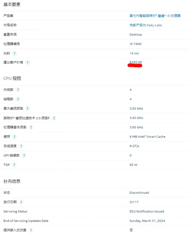 各位仔细看还能发现I5 6500支持的TSX到了7400没有了,现在可以查到的资料显示经过了幽灵、熔断、僵尸几波漏洞的补丁之后,前几代老U的性能一砍再砍。Intel对策是发布了微码更新,而微软的对策是禁用了相关的TSX事务拓展技术,这会导致CPU性能最多下降19%,英特尔出现了牙膏倒吸的情况。
