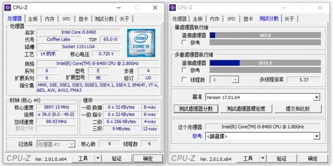 CPU-Z比较(I5 6500 I5 7400几乎一样)