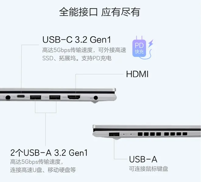 a豆14还有触控板集成数字小键盘、华硕银离子抗菌涂层覆盖保护、摄像头实体防窥遮罩、包含支持PD充电的高速USB-C 3.2 Gen1在内的全能接口等等,细节之处拉满。