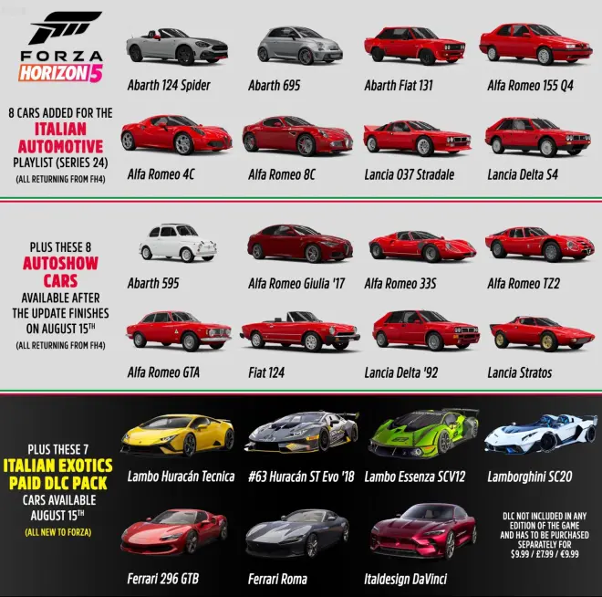 Playground Games宣布,次世代竞速游戏《极限竞速:地平线5》将推出意大利汽车补充包,共计发布16辆汽车。包括阿尔法罗密欧、菲亚特、蓝旗亚、阿巴斯等意大利知名汽车品牌的多款车型。8月15日起,前八款将在车展上公布,其余八款将在意大利汽车节上公布,直到9月14日陆续公布完毕。