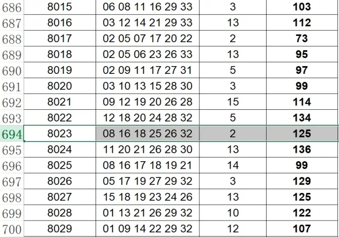其中最接近上期开奖号码的为第08023期,共四组号码一致: