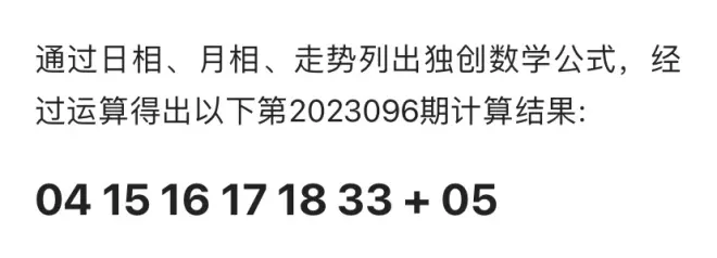 通过日相、月相、走势列出独创数学公式,经过运算得出以下第2023097期计算结果: