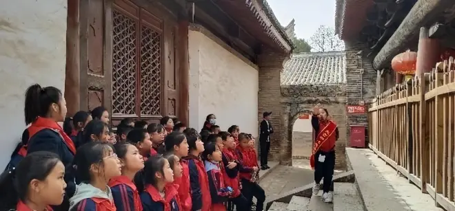 近日,在白水县仓颉庙西北野战军第一次代表会议旧址,史官中心校的“小小红色讲解员”为前来研学的学生们讲解西北野战军在白水的故事。