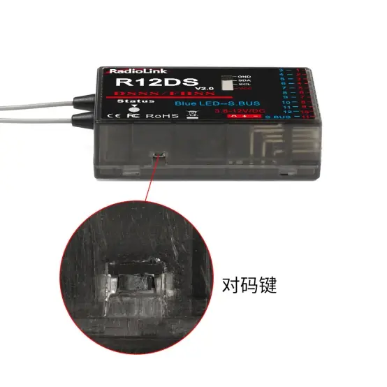 1、一秒内短按接收机侧面的对码键(ID SET)开关两次,完成普通11通道PWM和12通道SBUS信号的切换。