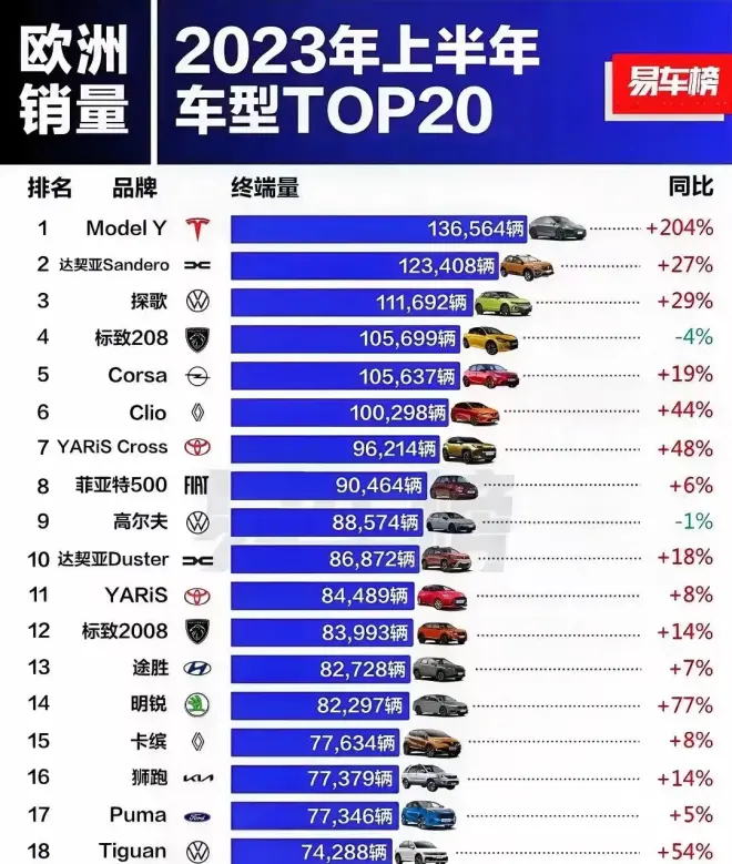 特斯拉不仅在国内受到消费者认可,在全球多个国家和地区表现同样抢眼。曾有媒体报道,中国乘用车最大的出口目的地为欧洲,而特斯拉凭借稳定的品质把控与技术革新,现已成为中国制造销向海外的主力军。据易车榜统计,2023年上半年Model Y在欧洲交付量已达136564辆,同比增长204%,稳坐欧洲上半年车型销量TOP1。