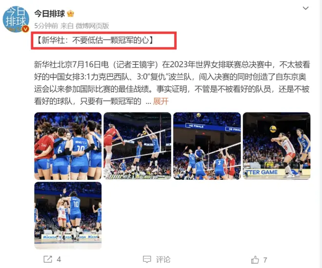 看到中国女排的出色表演,新华社正式给出了他们的表态,就在中午的13点,新华社用10个字盛赞女排:“不要低估一颗冠军的心。”并且夸奖女排靠着她们的团队和信念取得了胜利,其中单独点名的人并不是女排的王牌核心李盈莹,而是另外的两个人袁心玥和王云蕗,认为这两个人做出了贡献,尤其是王云蕗。
