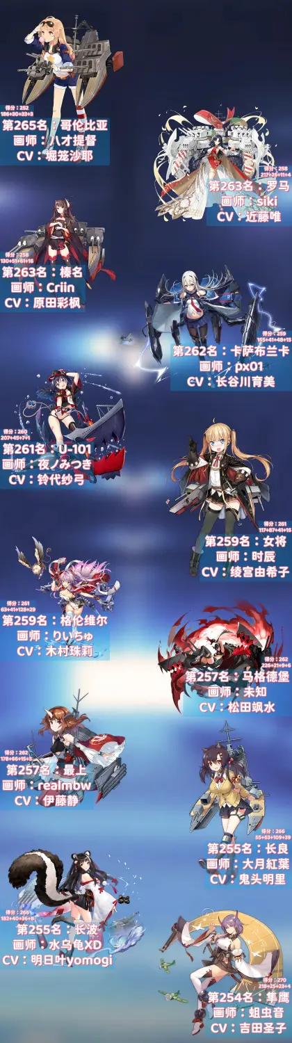 另外2023年2月23日实装的怨仇等五位舰娘此处并没有统计,因为这对于她们来说不太公平,需要一定的时间积累才能看到她们真正的排名位置。