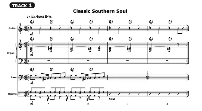 2,2和4小节的贝斯音符体现了灵魂风格贝斯的台阶式进行