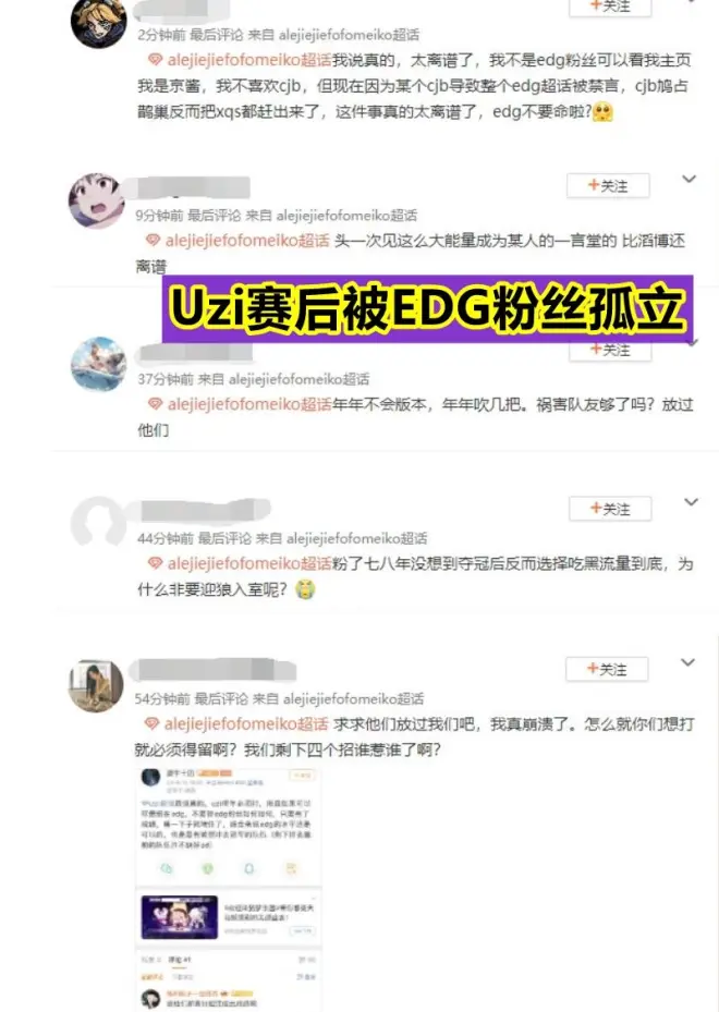 结束了这个赛季的旅程之后,EDG的粉丝突然弄出了一个新的东西,竟然是有人弄了一个“Ale、jiejie、fofo、Meiko”的4人超话,直接明牌把Uzi给孤立了出去。并且这个超话中,几乎全都是在指责Uzi,更有人怒斥EDG夺冠后选择吃黑流量,还有人说如果继续上Leave,EDG早就打进世界赛了。