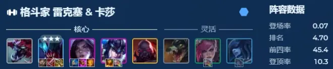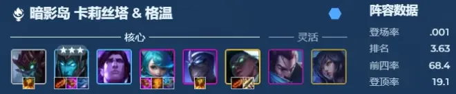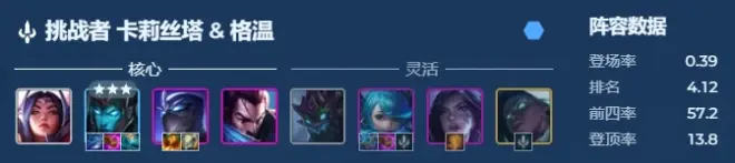 挑战滑板鞋和暗影岛这两个阵容组成差不多,除了暗影会优先养四费主C格温外,滑板鞋、慎、亚索卡莎这些牌基本都是两个阵容共用的。数据上看,暗影的整体吃分和吃鸡率会稍高一些