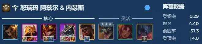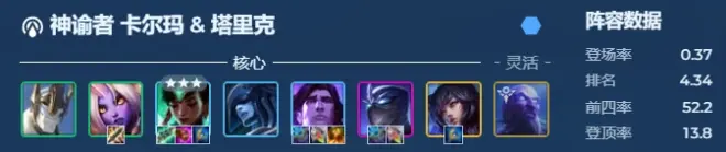 大成神谕因为有三星卡尔玛配合瑞兹狐狸双五费副C的后期,上限是非常高的,节奏顺利的话全2也能吃分,整体来说依然是优先级比较高的阵容!