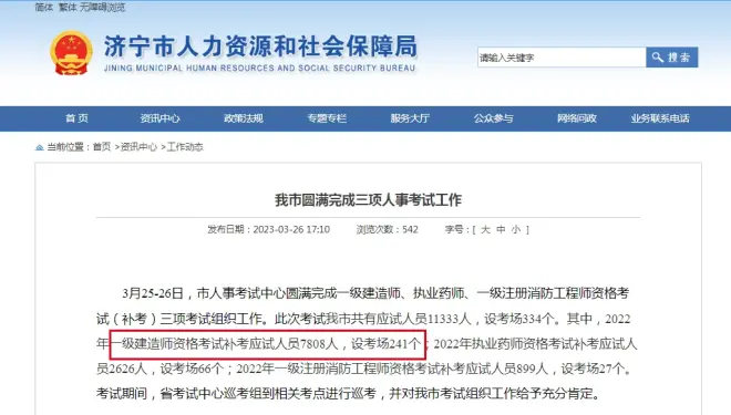 应试人数:2022年一级建造师资格考试补考应试人员7808人,设考场241个。