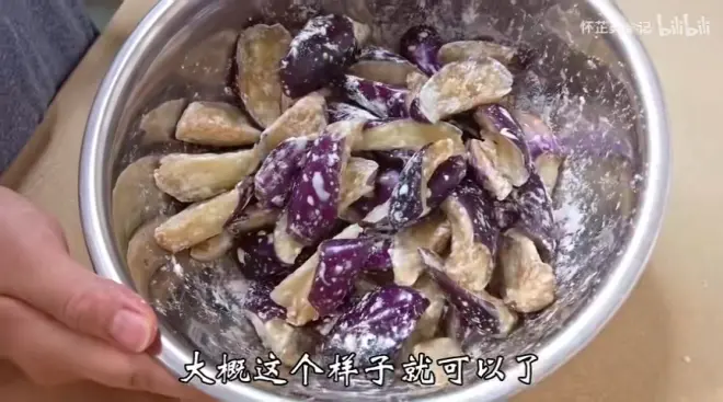茄子加盐腌制15分钟,腌制后挤出水分,加玉米淀粉裹住茄子