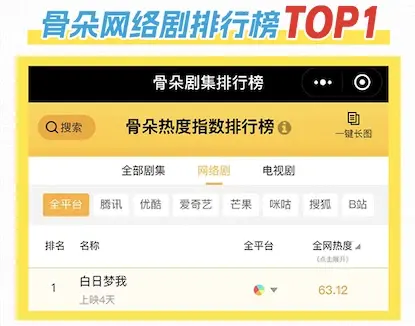 播放热度方面,《白日梦我》不仅在芒果TV站内热搜登顶,还在各大权威榜单中取得靠前排位,在骨朵数据中最高达到网络剧排行榜TOP1、分别在开播前、开播后达成微博剧集影响力榜待播榜 TOP1、热播榜 TOP1。