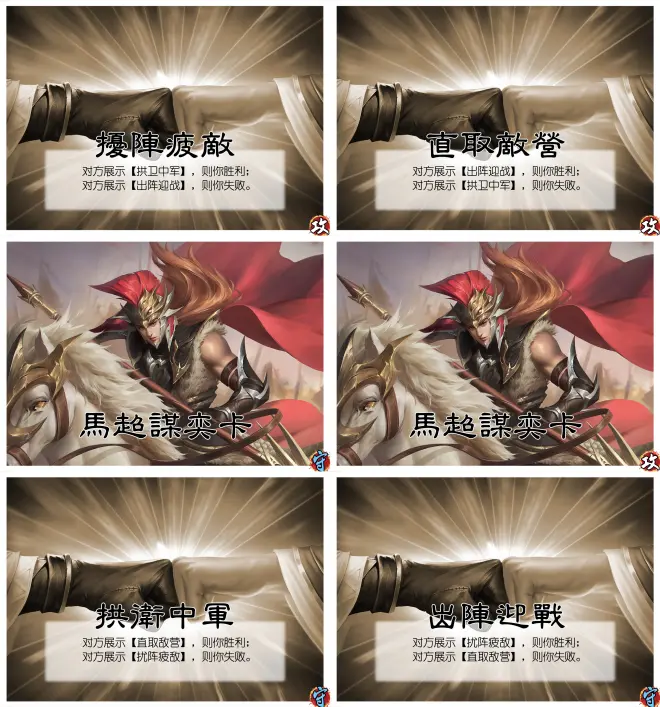 线下玩法,发起方选择“攻”的一张,另一方选择“守”中的一张,同时展示按牌面描述判断输赢。