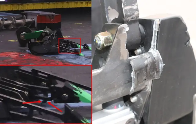 更大的问题出现在被Hydra弹飞之后。SawBlaze的叉子本身在落地后没事,但是左叉子和前铲连接的地方直接压弯了。本来这个部位是用来防止叉子移动幅度太大的,但机器落地时,动能加上叉子形成的杠杆造成了这个幅度在预期之外的伤害。