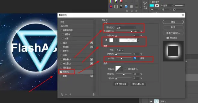 6.勾选发光选项,并设置参数为发白光,调整大小后点击确定,就可以得到初步的效果: