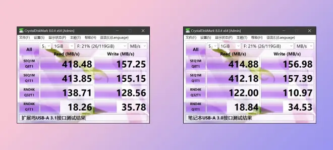 在数据传输方面,使用CrystalDiskMark软件对移动硬盘的传输速度进行测试。分别将移动硬盘接入扩展坞USB-A 3.1接口和笔记本USB-A 3.0接口进行读写测试,通过扩展坞测试移动硬盘时,连续读写速度最高可达418.48MB/秒和157.25MB/秒,而将移动硬盘直接接入笔记本的接口时,连续读写速度最高可达414.88/秒和156.98MB/秒。从测试数据来看,ORICO XDR RGB十二合一扩展坞对移动硬盘的连续写入速度几乎没有影响。