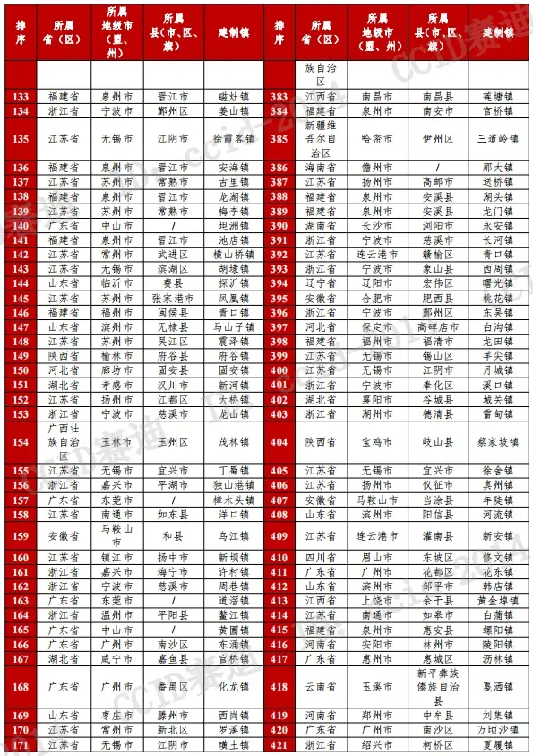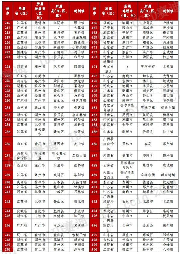 榜单前十名分别是江苏苏州玉山镇、广东佛山狮山镇、贵州遵义茅台镇、江苏苏州杨舍镇、广东珠海横琴镇、广东佛山北滘镇、广东东莞长安镇、江苏苏州锦丰镇、福建泉州陈埭镇、广东东莞虎门镇。
