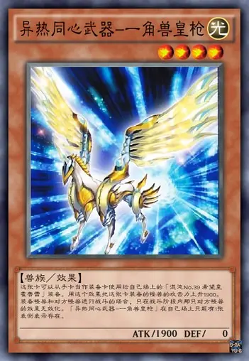 这张卡可以从手卡当作装备卡使用给自己场上的混沌No.39希望皇霍普雷装备。用这个效果把这张卡装备的怪兽的攻击力上升1900。装备怪兽和对方怪兽进行战斗的场合,只在战斗阶段内那只对方怪兽的效果无效化。异热同心武器一角兽皇枪在自己场上只能有1张表侧表示存在。