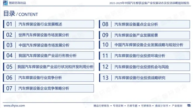 为方便行业人士或投资者更进一步了解汽车焊装设备行业现状与前景,智研咨询特推出《2023-2029年中国汽车焊装设备产业发展动态及投资战略规划报告》(以下简称《报告》)。报告对中国汽车焊装设备市场做出全面梳理和深入分析,是智研咨询多年连续追踪、实地走访、调研和分析成果的呈现。