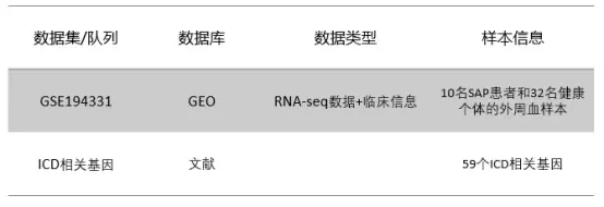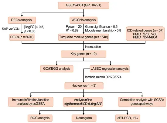 本研究建立了一种基于ICD相关基因利用WGCNA和机器学习算法筛选SAP疾病标志物,并分析其与免疫浸润和SCFA代谢的关系,最后进行表达验证。利用ICD新兴热点在非肿瘤生信版块的高创新性,并且搭上了“免疫”和“脂肪酸代谢”两大国自然热点,干湿结合达到6分+的水准,仅用1个月就接收,足以说明创新性和数据丰富度!所以趁着ICD方向在非肿瘤领域的发文好时机,赶快换个疾病复现吧