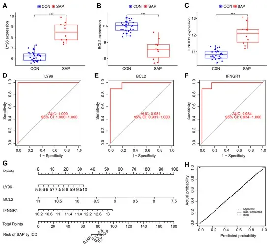 首先将DEGs、turquoise模块基因和ICD相关基因交叉以获得总共10个特征基因(图2A),通过LASSO回归分析确定最终的3个hub基因(LY96, BCL2,以及IFNGR1)(图2B)。在SAP和对照组比较3个hub基因的表达(图3A-C),并利用ROC曲线评估3个ICD hub基因作为SAP标志物的敏感性和特异性(图3D-F)。最后基于3个hub基因构建了一个列线图,并利用校准曲线验证一致性(图3G, H)。