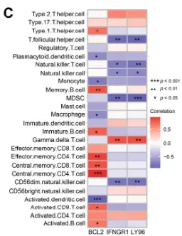 使用ssGSEA进一步研究SAP患者和健康对照之间免疫浸润表达的差异(图4B)。 分析免疫细胞浸润、免疫细胞功能与三个hub基因的相关性(图4C)。