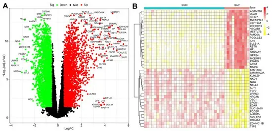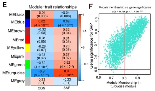 在GSE194331数据集中进行差异分析,获得5601个DEGs(图1A, B)。随后使用WGCNA算法与SAP表型相关的关键基因,确定了包含1548个基因的“turquoise”模块为SAP中最具临床价值的模块(图1E, F)。