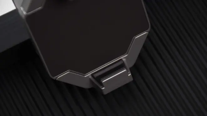 背夹的整体造型以八边形为主,融入硬核机甲风元素,背部的风扇格栅也对应设计成八边形,透过缝隙可以看到内部的风扇和散热片。周围有一圈RGB灯条点缀,点亮以后电竞氛围瞬间拉满。