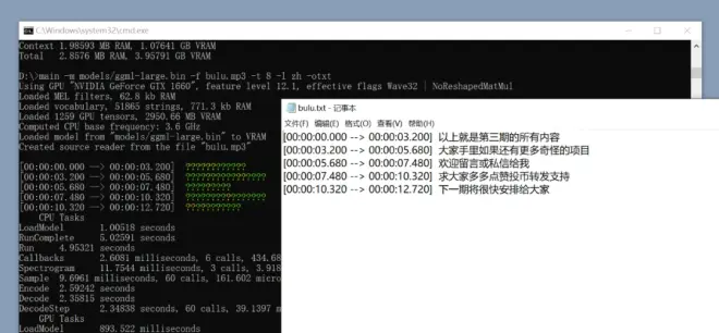 测试用的显卡是GTX1660,转换速度在可接受范围之内,上面这种简短的句子,用大的识别模型,在某些简单的语境条件下,以及加上最重要的因素——运气好的话,竟然有100%的准确度。