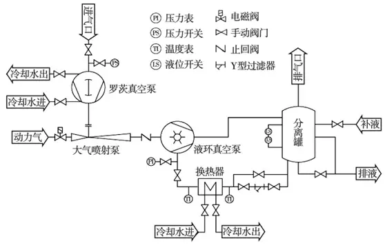特别是罗茨液环机组,如果在液环泵入口配上大气喷射器,如图5所示,既可以提高机组的极限真空,又可以降低罗茨泵的压缩比,在罗茨液环机组进入极限压力时,罗茨泵不会过热,液环泵亦不会产生气蚀。