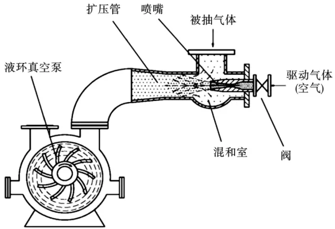 喷射器吸入的气体可以是空气,亦可以用液环泵排出的气体作为大气喷射器的驱动气体。