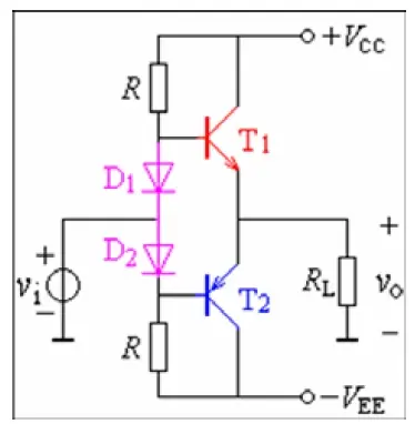 在Vi 输入电压接近于零时,D1、D2 给三极管T1、T2 提供偏置电压,使T1、T2 维持导通,以消除交越失真。
