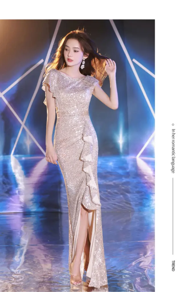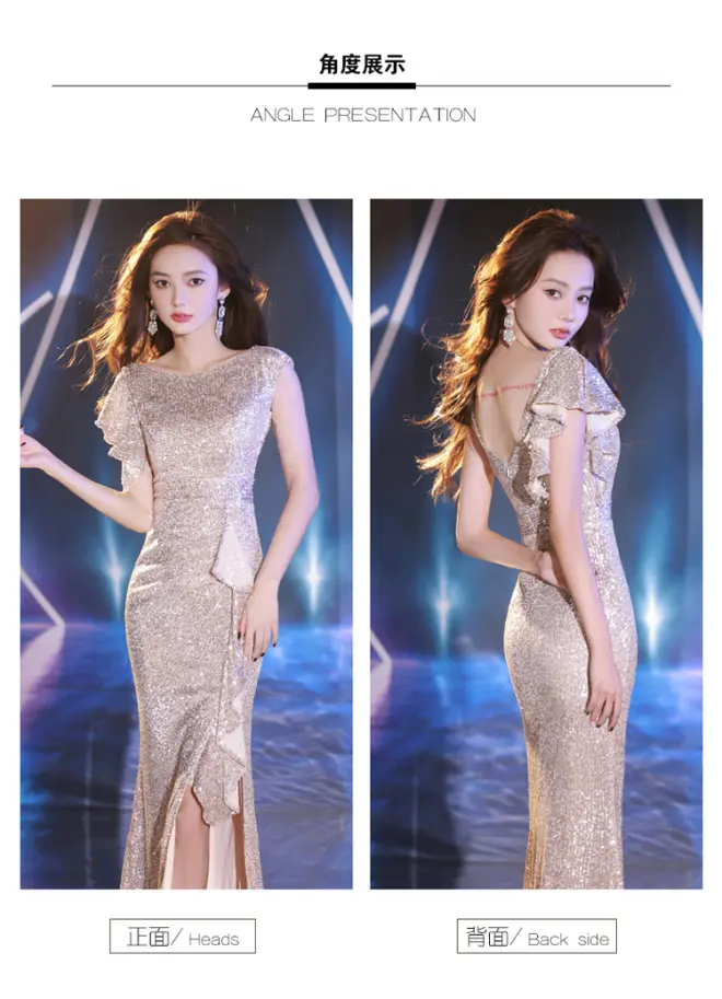 » 香槟色晚礼服女2023新款高端气质亮片鱼尾修身名媛主持人裙高级感
