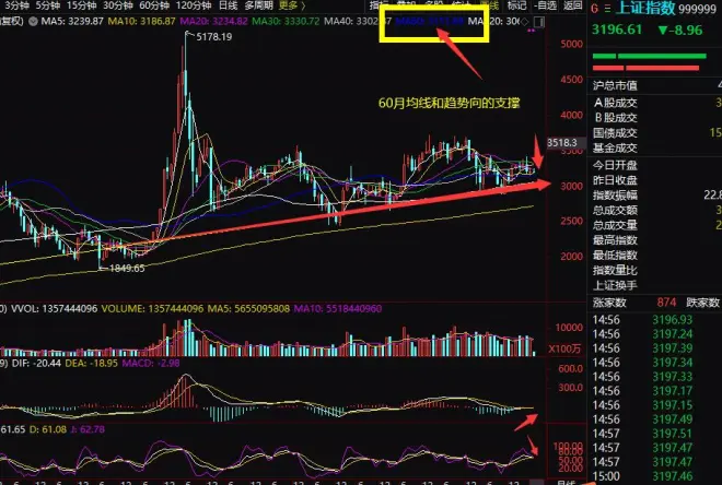月线走势要点:我们现在再来看越线走势图,如下图,我们做出了一个上升趋势线,这个上升趋势线属于强支撑的趋势线,那么本周的回调,基本上也接近了趋势线,趋势线的点位大概在3080附近。目前月线M金叉后进入黏连状态,在股价上表现就是于焦灼状态,而月KDJ即将死叉,M水下金叉,K死叉,一般而言这个技术结构是买讯,在低位区间时,尤是如此。因此这里也具备强的支撑力。另个角度,我们看到60月均线支撑位在3151附近,这里也有比较强的支撑。那么月线上3080-3150几乎就是近半年的强势支撑区域。