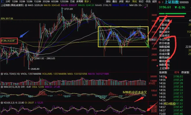 日线走势要点:面对周线的不确定性,下面我们再再来看日线,日线就比较有意思,日线的MACD水下金叉,要死不死,这样的形态很像是青蛙跳,面对要死不死的形态,在即将死叉的时候,就是反弹起跳的是时候。同时日线M水下金叉,而日线kdj死叉,也是买讯;而3150点位于日线618支撑共振形成强的支撑。结合以上技术特点,日线反弹一触即发,但日线上辖在3130附近有一个缺口,如果按照逢缺必补的原则,这里假定去补掉缺口,则日线必然走出M底背离,M面底背驰,甚至K也有机会底背驰;因此日线结构上我们进一步锁定了3130-3150的关键点位