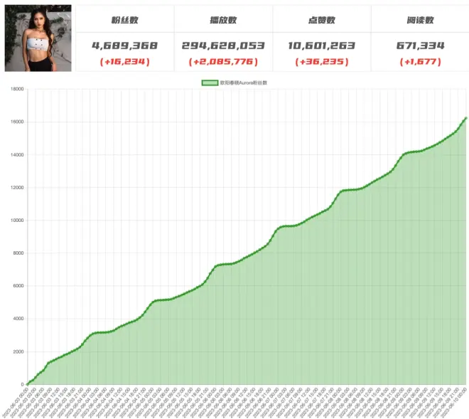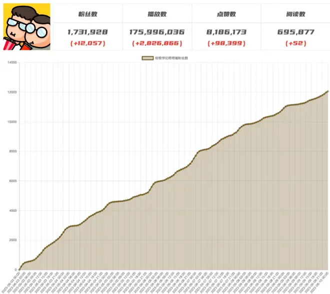 观看指南: UP名字可点击跳转;增长数据红色为增加, 蓝色为无变化,绿色为减少;预测数据 红色可信度最高,蓝色其次,黑色最低