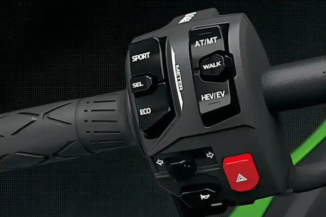 这款混动Ninja的电动机安装在变速器上方、内燃机进气道下方,并通过电子控制离合器连接到变速箱。允许电驱动元件根据需要来接合和脱离。虽然变速箱的内部设计依然可能是传统6速变速箱,但它没有变速杆或手动离合器。在左车把上有一个按钮式换档器,使传统手动变速箱成为半自动变速箱。